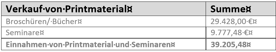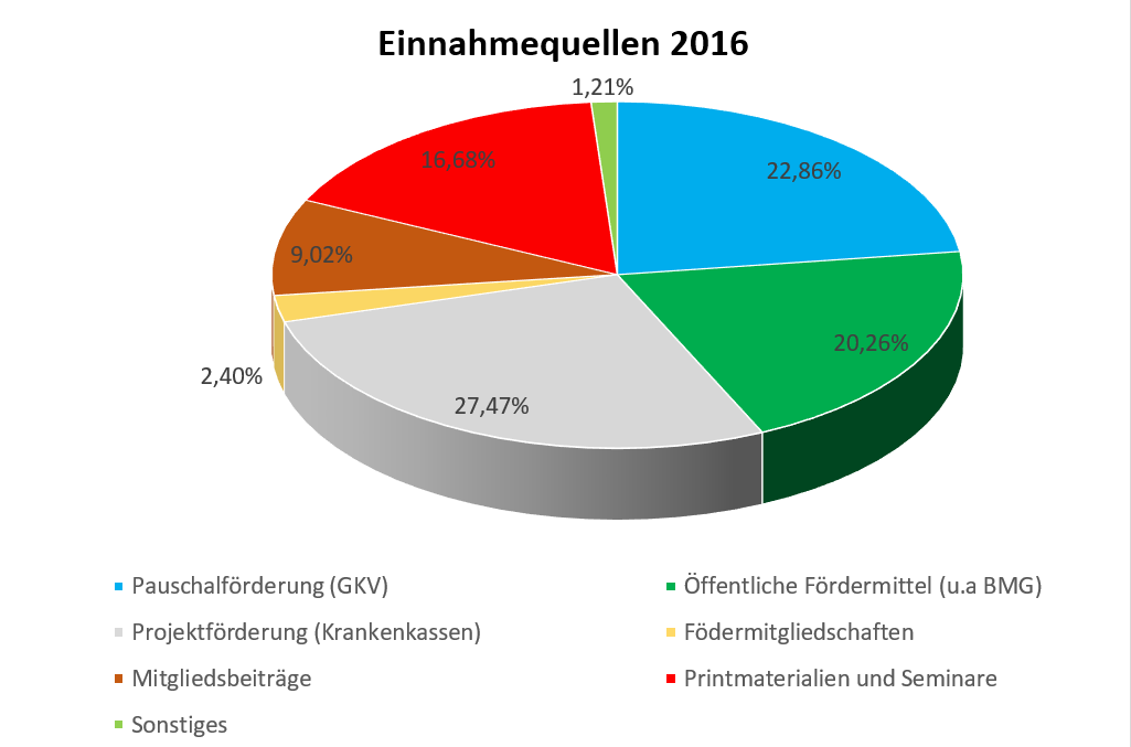 Im Berichtsjahr erhielten wir Fördermittel der Gesetzlichen Krankenkassen gemäß §20 h SGB V in Höhe von 447.316,30 €, das entspricht etwa 73% der Gesamteinnahmen. Darin sind enthalten: |
