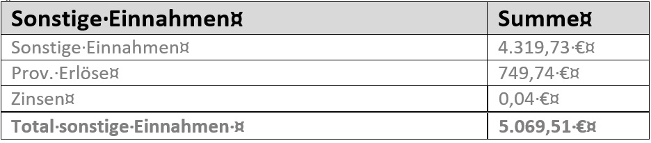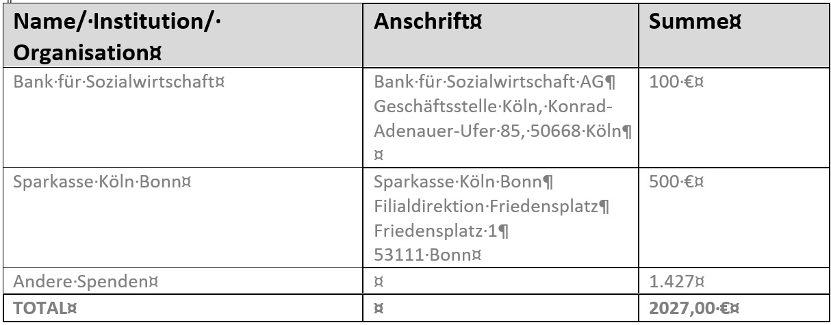 Im Berichtsjahr erhielten wir Förderbeiträge von Einzelpersonen und auch Unternehmen/Organisationen in Höhe von 2027,00 Euro (0,32% aller Einnahmen).