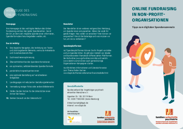 Diese Fragen stellen sich vermehrt auch die Verbände der Selbsthilfe. Der BApK als Bundesverband möchte seinen Mitgliedern und anderen Akteuren aus der verbandlichen Selbsthilfe ein qualifiziertes Informationsangebot zu diesem Thema anbieten und hat wesentliche Informationen für Sie zusammengestellt. Checklisten und Ablaufpläne unterstützen Sie bei der Vorbereitung Ihres eigenen Fundraising-Projektes.